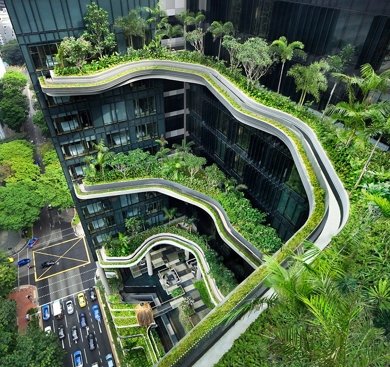 Готель «Parkroyal» у Сінгапурі славний своїми величезними терасами, на яких ростуть тропічні рослини — вікна кожного номеру такого готелю виходять на такі зелені подвір’я. Насолода для любителів красивих садків гарантована!