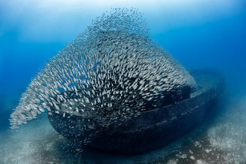 Фотограф Фаби Фрегонези исследовал место для дайвинга в водах своей родины, Бразилии, когда наткнулся на удивительную рыбную формацию. Огромная стая рыб, казалось, «танцевала» над обломками буксира, известного как «Дева», на мгновение создавая форму паруса. Фотография заняла третье место на престижном конкурсе.
