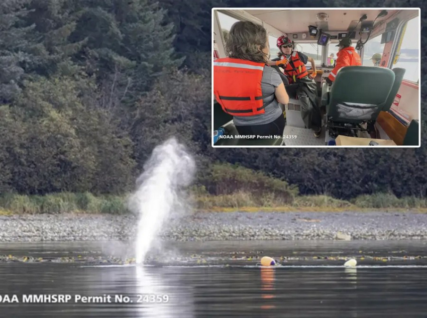 Работая совместно, биологи из Службы национальных парков (NPS) и сотрудники Национального управления океанических и атмосферных исследований (NOAA) обнаружили, что молодой горбатый кит запутался в 204-килограммовой сетке и двух буях, соединенных с котлом для крабов весом 150 килограммов, которые прикрепили его к морскому дну.